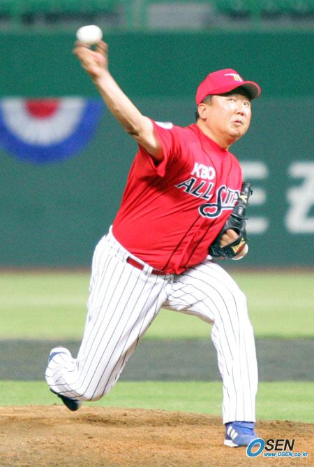 2005 삼성 PAVV 올스타 전야제가 15일 인천 문학구장에서 열렸다. 전야제의 하이라이트인 올드스타전에서 프로 지도자들로 구성된 KBO(한국야구위원회) 올스타의 마지막 투수로 나선 선동렬 삼성 감독이 힘차게 볼을 뿌리고 있다./인천=주지영 기자 jj0jj0@osen.co.kr [Copyright ⓒ OSEN(www.osen.co.kr) 무단전재 및 재배포 금지]