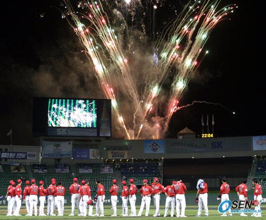 2005 삼성 PAVV 올스타 전야제가 15일 인천 문학구장에서 열렸다. 전야제의 하이라이트인 올드스타전이 끝난 뒤 폭죽이 터지고 있다./인천=주지영 기자 jj0jj0@osen.co.kr [Copyright ⓒ OSEN(www.osen.co.kr) 무단전재 및 재배포 금지]