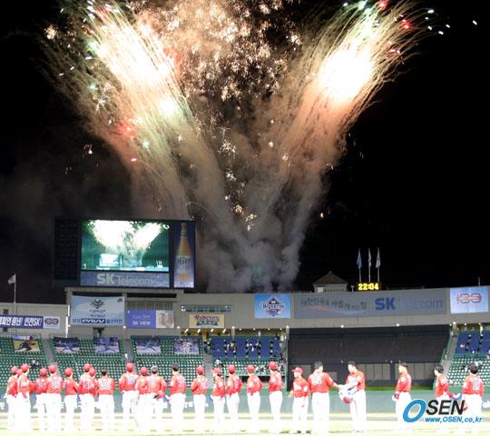 2005 삼성 PAVV 올스타 전야제가 15일 인천 문학구장에서 열렸다. 전야제의 하이라이트인 올드스타전이 끝난 뒤 불꽃놀이가 펼쳐지고 있다./인천=주지영 기자 jj0jj0@osen.co.kr [Copyright ⓒ OSEN(www.osen.co.kr) 무단전재 및 재배포 금지]
