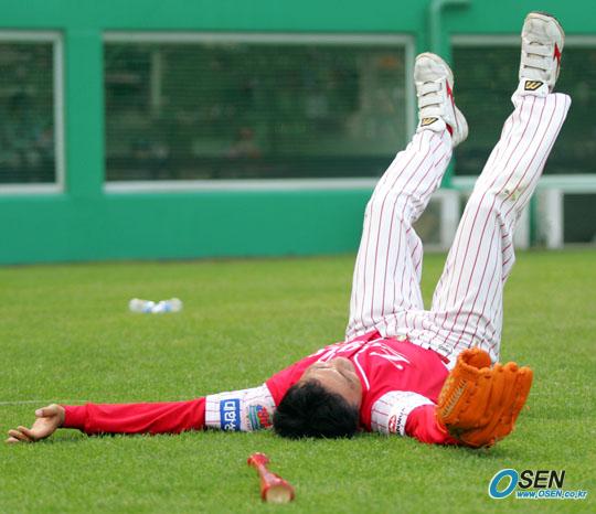 파울 타구를 잡고 뒤로 넘어진 송진우