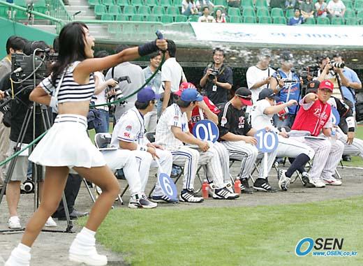 16일 인천 문학구장에서 벌어진 2005 삼성 PAVV 프로야구 올스타전에 앞서 열린 8개 구단 치어리더 경연대회가 열렸다. 첫 팀으로 나온 현대 치어리더가 호스로 시원한 물줄기를 뿌려대자 각 구단을 대표해 심사위원으로 나온 선수들이 깜짝 놀라고 있다. /인천=손용호 기자 spjj@osen.co.kr [Copyright ⓒ OSEN(www.osen.co.kr) 무단전재 및 재배포 금지]