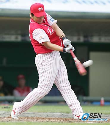 16일 인천 문학구장에서 벌어진 2005 삼성 PAVV 프로야구 올스타전 5회말 종료 후 열린 홈런 레이스에서 한화의 김태균이 SK 박재홍을 5-2로 물리치고 홈런 킹의 자리에 올라섰다. 김태균에게 승리를 안겨준 3번째 홈런이 터지는 순간이다./인천=손용호 기자 spjj@osen.co.kr [Copyright ⓒ OSEN(www.osen.co.kr) 무단전재 및 재배포 금지]