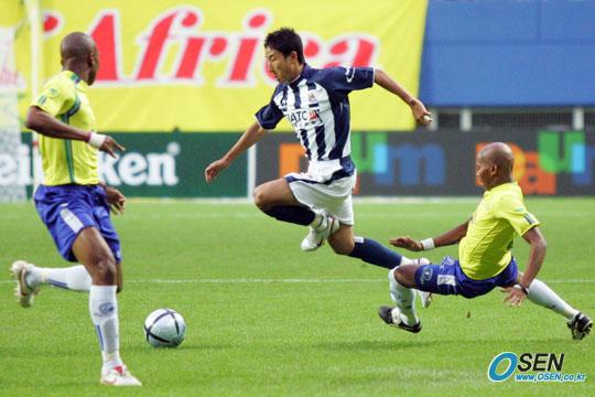 태클을 뛰어 넘어 돌진하는 이천수