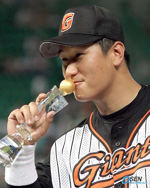 16일 인천 문학구장에서 벌어진 2005 삼성 PAVV 프로야구 올스타전에서 대망의 MVP는 롯데 자이언츠의 이대호가 차지했다. 8회 역전 결승 2점 홈런을 날려 MVP를 수상한 이대호가 MVP 트로피에 키스하고 있다./인천=손용호 기자 spjj@osen.co.kr [Copyright ⓒ OSEN(www.osen.co.kr) 무단전재 및 재배포 금지]