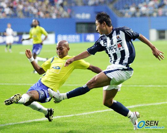 16일 대전 월드컵경기장에서 벌어진 피스컵 2005 코리아 대회 B조 선다운스 FC 와 레알 소시에다드의 경기 전반 이번 대회에 한해 레알 소시에다드 소속으로 뛰는 이천수가 왼쪽 측면을 돌파, 문전으로 크로스를 올리고 있다. 골키퍼의 다이빙 펀칭으로 아쉽게 찬스가 무산됐다./대전=주지영 기자 jj0jj0@0sen.co.kr [Copyright ⓒ OSEN(www.osen.co.kr) 무단전재 및 재배포 금지]