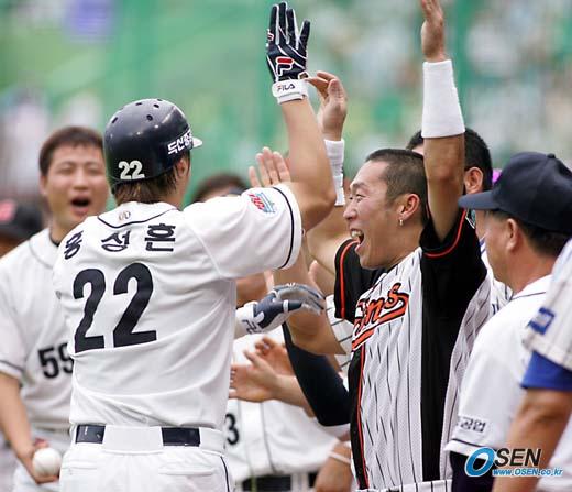 16일 인천 문학구장에서 벌어진 2005 삼성 PAVV 프로야구 올스타전서 동군이 서군에 6-5로 역전승했다. 동군의 4회말 두산의 홍성흔이 솔로 홈런을 치고 들어오자 둘도 없는 친구인 롯데의 정수근이 두 팔을 높이 들며 반갑게 맞이하고 있다. /인천=손용호 기자 spjj@osen.co.kr [Copyright ⓒ OSEN(www.osen.co.kr) 무단전재 및 재배포 금지]