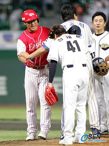 16일 인천 문학구장에서 벌어진 2005 삼성 PAVV 프로야구 올스타전서 동군이 서군에 6-5로 역전승했다. 9회초 2사 1,2루서 조인성이 타석에 나와 원스트라이크인 상황에서 뒤늦게 대타로 출전, 내야 땅볼로 아웃된 장종훈(왼쪽)이 자신을 상대한 두산 투수 정재훈의 인사를 받고 있다. 지난달 은퇴한 장종훈은 이날 특별 초청 선수로 참가했다./인천=손용호 기자 spjj@osen.co.kr [Copyright ⓒ OSEN(www.osen.co.kr) 무단전재 및 재배포 금지]