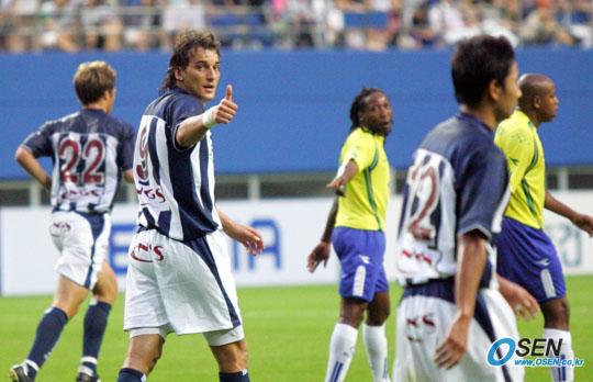 16일 대전 월드컵경기장에서 벌어진 피스컵 2005 코리아 대회 B조 선다운스 FC 와 레알 소시에다드의 경기 전반 이번 대회에 한해 레알 소시에다드 소속으로 뛰는 이천수가 날린 슛이 빗나가자 간판 스트라이커인 코바체비치가 실패했지만 좋았다는 의미로 엄지를 치켜 올려 보이고 있다./대전=주지영 기자 jj0jj0@0sen.co.kr [Copyright ⓒ OSEN(www.osen.co.kr) 무단전재 및 재배포 금지]
