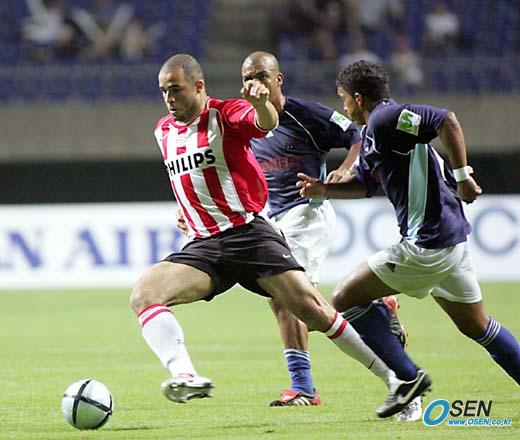17일 광주 월드컵경기장에서 벌어진 피스컵 2005 코리아 대회 A조 PSV 아인트호벤과 온세 칼다스의 경기는 0-0으로 승부를 가리지 못했다. 후반 공격에 가담한 아인트호벤의 수비수 알렉스가 온세 칼다스의 수비를 뜷고 드리블을 하고 있다./광주=손용호 기자 spjj@osen.co.kr [Copyright ⓒ OSEN(www.osen.co.kr) 무단전재 및 재배포 금지]