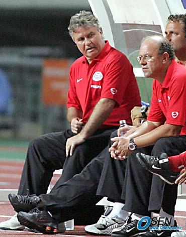 17일 광주 월드컵경기장에서 벌어진 피스컵 2005 코리아 대회 A조 PSV 아인트호벤과 온세 칼다스의 경기는 0-0으로 승부를 가리지 못했다. 히딩크 감독이 0-0으로 무승부로 경기가 끝나려 하자 아쉬운 표정을 짓고 있다./광주=손용호 기자 spjj@osen.co.kr [Copyright ⓒ OSEN(www.osen.co.kr) 무단전재 및 재배포 금지]