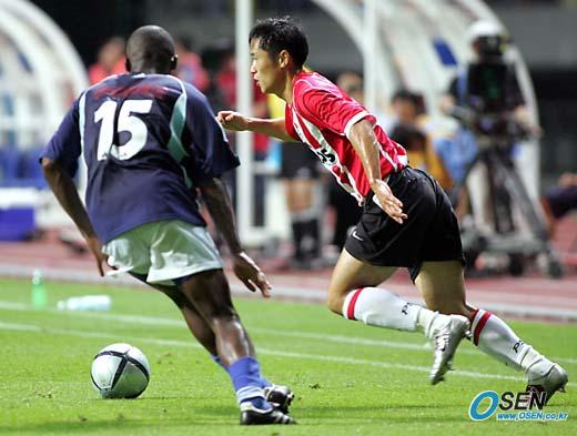 17일 광주 월드컵경기장에서 벌어진 피스컵 2005 코리아 대회 A조 PSV 아인트호벤과 온세 칼다스의 경기는 0-0으로 승부를 가리지 못했다. 후반 이영표가 온세 칼다스 수비 디아스가 따라 붙자 외곽으로 방향을 전환, 드리블하고 있다./광주=손용호 기자 spjj@osen.co.kr [Copyright ⓒ OSEN(www.osen.co.kr) 무단전재 및 재배포 금지]