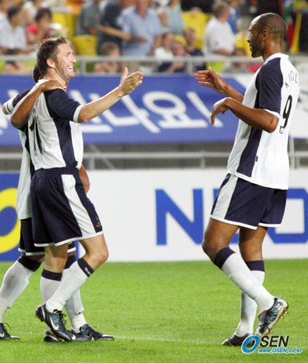 18일 수원 월드컵경기장에서 벌어진 피스컵 2005 코리아 대회 B조 토튼햄 핫스퍼와 선다운스 FC의 경기 후반 3-0을 만드는 자신의 두 번째골을 넣은 간판 스타 로비 킨(왼쪽)이 앞서 팀의 두 번째골을 뽑았던 동료 프레드릭 카누테에게 다가서며 즐거워하고 있다./수원=주지영 기자 jj0jj0@osen.co.kr [Copyright ⓒ OSEN(www.osen.co.kr) 무단전재 및 재배포 금지]
