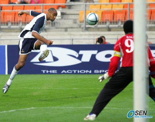 18일 수원 월드컵경기장서 벌어진 피스컵 2005 코리아 대회 B조 2차전 토튼햄 핫스퍼와 선다운스 FC의 경기 전반 토튼햄의 프레드릭 카누테가 상대 문전에서 멋진 왼발슛을 날렸으나 볼은 골문을 벗어났다./수원=주지영 기자 jj0jj0@osen.co.kr [Copyright ⓒ OSEN(www.osen.co.kr) 무단전재 및 재배포 금지]