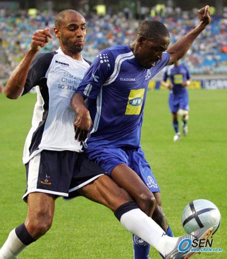 18일 수원 월드컵경기장서 벌어진 피스컵 2005 코리아 대회 B조 2차전 토튼햄 핫스퍼와 선다운스 FC의 경기서 토튼햄의 스트라이커 프레드릭 카누테가 상대 선수 뒤에서 왼발을 뻗어 볼을 차고 있다./수원=주지영 기자 jj0jj0@osen.co.kr [Copyright ⓒ OSEN(www.osen.co.kr) 무단전재 및 재배포 금지]