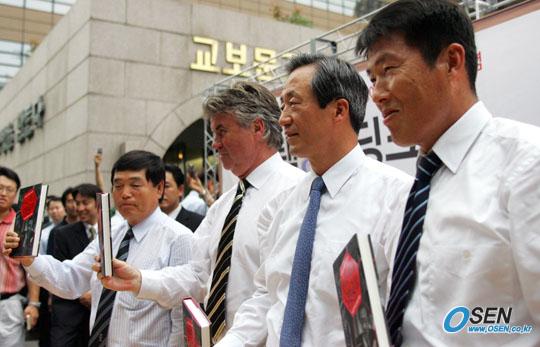 19일 오후 2시 서울 광화문 교보문고 중앙광장에서 진행된 '한국축구의 영웅들' 출판 기념 사인회에 앞서 이회택 대한축구협회 부회장, 히딩크 아인트호벤 감독, 정몽준 대한축구협회장, 차범근 수원 삼성 감독이 책자를 들어 보이고 있다. /주지영 기자 jj0jj0@osen.co.kr [Copyright ⓒ OSEN(www.osen.co.kr) 무단전재 및 재배포 금지]