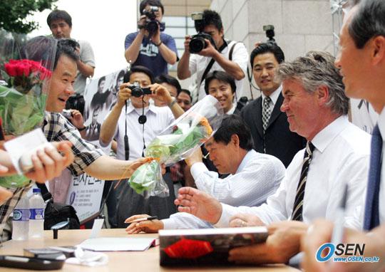 19일 오후 2시 서울 광화문 교보문고 중앙광장에서 진행된 '한국축구의 영웅들' 출판 기념 사인회에서 중년의 축구 팬이 히딩크 아인트호벤 감독에게 꽃다발을 선물하고 있다./주지영 기자 jj0jj0@osen.co.kr [Copyright ⓒ OSEN(www.osen.co.kr) 무단전재 및 재배포 금지]