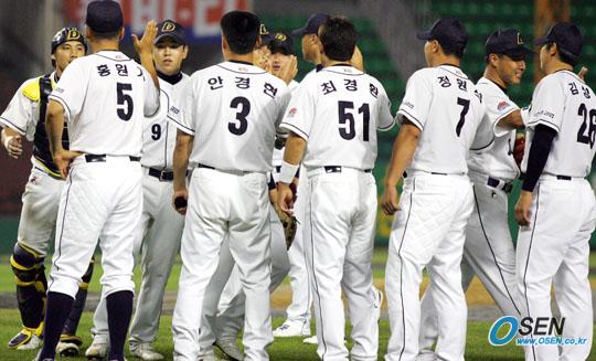19일 잠실 구장에서 벌어진 프로야구 후반기 첫 경기서 한화 이글스를 3-2로 꺾은 두산 베어스 선수들이 경기 후 승리를 즐기고 있다./잠실=주지영 기자 jj0jj0@osen.co.kr [Copyright ⓒ OSEN(www.osen.co.kr) 무단전재 및 재배포 금지]