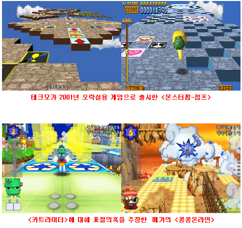 [디스이즈게임 - 김광택 기자]콩콩온라인, 몬스터팜-점프 표절 의혹 넥슨의 온라인게임 에 최근 업데이트된 우주맵과 부스터존, 점프존이 자사의 온라인게임을 표절한 의혹이 있다고 주장했던 메가엔터프라이즈가 곤란한 상황에 처했다. 메가엔터프라이즈의 이 일본의 유명게임업체인 테크모에서 지난 2001년 출시한 를 표절했다는 의혹이 제기됐기 때문. 실제 두 게임은 3차원 공간에서 점프로 경주를 하고 화살표(일종의 부스터존)를 밟으면 긴 가속점프가 가능하다는 점 등 게임의 핵심요소가 매우 비슷하다. 넥슨의 ‘제라 표절파동’과 마찬가지로 인터넷 유저에 의해 먼저 제기된 표절의혹은 지난 2001년 메가엔터프라이즈가 의 국내유통사였다는 사실 때문에 파장은 더욱 커질 것으로 예상된다. 메가엔터프라이즈가 당시 를 국내에 유통한 것은 맞지만 이후 온라인게임으로 개발하기 위한 라이센스권을 확보한 것은 아니기 때문이다. 처음으로 의혹을 제기한 유저 역시 ‘판권’을 가지고 만들지 않았다면 무단도용이라고 주장했다. 사태가 커질 경우 “가 의 주요 컨셉들을 표절한 의혹이 있다”고 주장했던 메가엔터프라이즈의 입장은 더욱 난처하게 될 상황이다. 이에 대해 메가엔터프라이즈 관계자는 “은 메가엔터프라이즈에서 자체개발한 순수 국산게임”이라며 “뛴다는 느낌만 비슷할 뿐 많은 부분에서 다르다”고 해명했다. 한편 표절파동이 걷잡을 수 없이 확산되면서 또 다른 인터넷 유저는 넷마블에서 서비스하는 이 영화 을 베꼈다고 주장했다. 이 유저는 의 맵이 영화 에 나오는 ‘모리아 광산’과 ‘발린의 무덤’을 그대로 도용했다고 이유를 설명했다. 또 SK커뮤니케이션즈의 ‘싸이월드’는 게임아이템으로 판매한 가 반다이코리아에서 PSP용으로 발매한 를 표절했다는 의혹을 받으면서 관련 서비스를 바로 중지하는 해프닝을 일으키기도 했다. [Copyright ⓒ OSEN(www.osen.co.kr) 무단전재 및 재배포 금지]