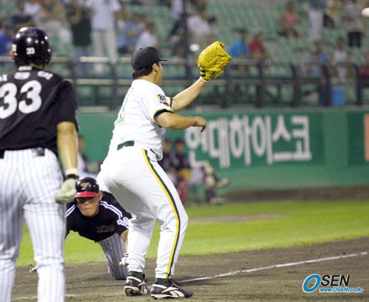 20일 현대 유니콘스와 LG 트윈스 수원 경기 LG의 5회초 1사 1,3루서 보기 드문 장면이 연출됐다. 정의윤 대타로 나온 이성렬이 볼넷을 얻는 순간 폭투가 되면서 3루 주자 박용택이 홈인했고 1루 주자 최동수는 3루까지 진출했다. 이 사이 이성렬이 2루를 노리자 현대 포수 강귀태의 2루 송구가 악송구가 되면서 3루에 있던 최동수에 이어 이성렬까지 단번에 홈인하고 있다./수원=주지영 기자 jj0jj0@osen.co.kr [Copyright ⓒ OSEN(www.osen.co.kr) 무단전재 및 재배포 금지]