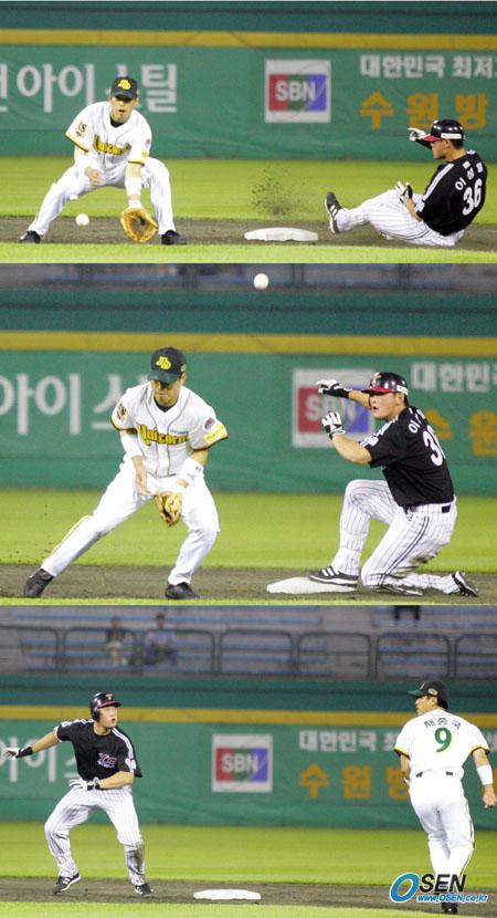 20일 현대 유니콘스와 LG 트윈스 수원 경기 LG의 5회초 1사 1,3루서 보기 드문 장면이 나왔다. 정의윤 대타로 나온 이성렬이 볼넷을 얻는 순간 폭투가 되면서 3루 주자 박용택이 홈인했고 1루 주자 최동수는 3루까지 진출했다. 이 사이 이성렬이 2루를 노릴 때(위 사진)현대 포수 강귀태의 2루 송구가 악송구가 돼(가운데 사진) 2루수 채종국이 볼을 뒤로 빠트리고(아래 사진) 있다. 그러자 3루에 있던 최동수에 이어 이성렬까지 단번에 홈인하는 진풍경을 연출했다./수원=주지영 기자 jj0jj0@osen.co.kr [Copyright ⓒ OSEN(www.osen.co.kr) 무단전재 및 재배포 금지]