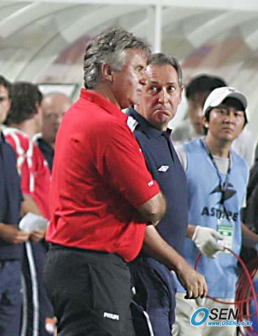 20일 수원 월드컵경기장에서 벌어진 피스컵 2005 코리아 A조 최종전 PSV 아인트호벤-올림피크 리옹의 경기가 1-1로 끝나 리옹이 다득점에 의해 결승에 진출했다. 경기가 끝난 뒤 히딩크 아인트호벤 감독이 벤치를 벗어나는 리옹 감독의 팔을 뒤에 잡아 끌며 축하하고 있다./수원=손용호 기자 spjj@osen.co.kr [Copyright ⓒ OSEN(www.osen.co.kr) 무단전재 및 재배포 금지]