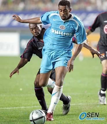 20일 수원 월드컵경기장에서 벌어진 피스컵 2005 코리아 A조 최종전 PSV 아인트호벤-올림피크 리옹의 경기는 1-1로 끝나 다득점에 의해 리옹이 결승에 진출했다. 경기 종료 전 이영표의 어시스트를 받은 아인트호벤의 호베르트가 결정적인 찬스를 잡고 슛을 날렸으나 골문을 빗나갔다./수원=손용호 기자 spjj@osen.co.kr [Copyright ⓒ OSEN(www.osen.co.kr) 무단전재 및 재배포 금지]