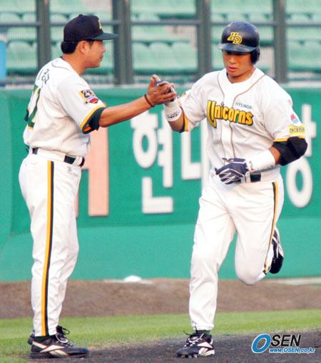 20일 현대 유니콘스와 LG 트윈스의 수원 경기 현대의 1회말 2사 후 송지만이 중월 선제 솔로 홈런을 날린 뒤 이광근 3루코치의 환영을 받으며 홈으로 달리고 있다./수원=주지영 기자 jj0jj0@osen.co.kr [Copyright ⓒ OSEN(www.osen.co.kr) 무단전재 및 재배포 금지]