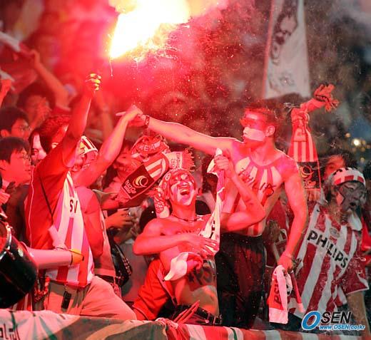 20일 수원 월드컵경기장에서 벌어진 피스컵 2005 코리아 A조 최종전 PSV 아인트호벤-올림피크 리옹의 경기는 1-1로 끝나 다득점에 의해 리옹이 결승에 진출했다. 후반 아인트호벤의 서포터스들이 불꽃을 이용, 응원하고 있다./수원=손용호 기자 spjj@osen.co.kr [Copyright ⓒ OSEN(www.osen.co.kr) 무단전재 및 재배포 금지]