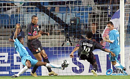 20일 수원 월드컵경기장에서 벌어진 피스컵 2005 코리아 A조 최종전 PSV 아인트호벤-올림피크 리옹의 경기는 1-1로 끝나 다득점에 의해 리옹이 결승에 진출했다. 후반 리옹의 플로랑 말루다가 천금같은 동점골을 넣고 있다./수원=손용호 기자 spjj@osen.co.kr [Copyright ⓒ OSEN(www.osen.co.kr) 무단전재 및 재배포 금지]