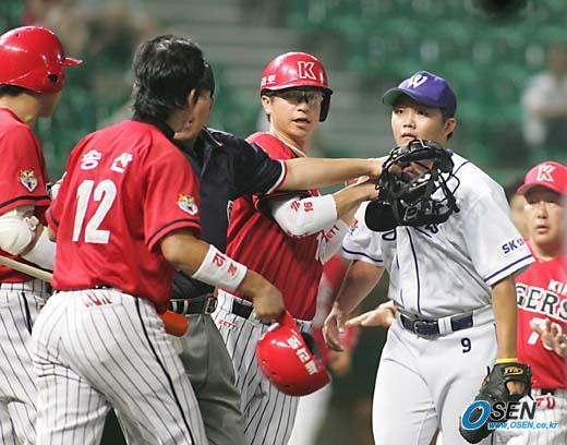 21일 인천 문학구장에서 벌어진 SK 와이번스와 기아 타이거즈의 경기 기아의 6회초 1사 2,3루 이종범의 3루 땅볼 때 협격에 걸린 3루 주자 송산(왼쪽)이 홈을 커버하던 투수 조영민(오른쪽)과 부딪쳤다. 이에 고의성이 있다고 본 조영민이 송산의 뒤통수를 가볍게 글러브로 치자 발끈한 송산이 조영민과 몸싸움을 벌이는 것을 임채섭 구심과 동료들이 떼어 놓고 있다. /인천=손용호 기자 spjj@osen.co.kr. [Copyright ⓒ OSEN(www.osen.co.kr) 무단전재 및 재배포 금지]