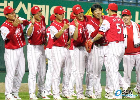 21일 두산 베어스와 한화 이글스의 잠실 경기서 4-3으로 이긴 한화 선수들이 승리를 자축하고 있다. 3위 한화는 2위 두산에 2연승을 거둠으로써 승차를 2게임으로 줄였다./잠실=주지영 기자 jj0jj0@osen.co.kr [Copyright ⓒ OSEN(www.osen.co.kr) 무단전재 및 재배포 금지]