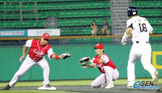 21일 두산 베어스와 한화 이글스의 잠실경기 두산의 9회말 1사 1루서 전상렬의 땅볼을 잡은 한화 투수 지연규가 병살을 위해 2루로 송구하자 볼을 받으러 들어온 유격수 브리또(왼쪽)의 옆에서 2루수 한상훈이 함께 포구 자세를 취하고 있다./잠실=주지영 jj0jj0@osen.co.kr [Copyright ⓒ OSEN(www.osen.co.kr) 무단전재 및 재배포 금지]