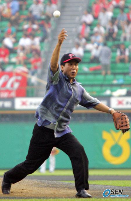 22일 LG 트윈스와 두산 베어스의 잠실 경기에 앞서 신선우 창원 LG 세이커스 농구단 감독이 시구하고 있다. 팔을 백스윙하는 동작은 비교적 안정됐으나 릴리스포인트가 부적절했다./잠실=주지영 기자 jj0jj0@osen.co.kr [Copyright ⓒ OSEN(www.osen.co.kr) 무단전재 및 재배포 금지]