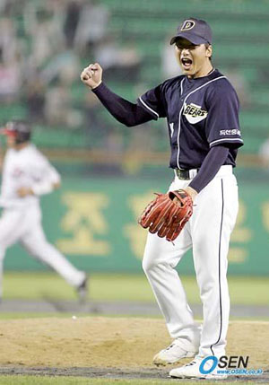 22일 잠실경기가 시작되기 전 프로농구 창원 LG 세이커스의 신선우 감독이 이순철 LG 감독을 찾아 KCC 시절 우승을 차지할 때 썼던 것과 똑같은 종류의 손수건을 선물했다. 연세대 후배인 이 감독에게 행운을 비는 뜻이었지만 운이 필요한 건 김경문 두산 감독도 마찬가지였다. 김 감독은 경기 전 최훈재 타격코치가 작성한 선발 라인업에서 두 명이나 이름을 지워냈다. 전날 한화전 도중 부상을 당한 장원진과 홍성흔이 경기에 나서기 힘든 상황. 주포 김동주가 또 다시 부상이 도진 터라 두산으로선 최근 기세 좋은 LG를 맞아 운 이상의 것이 필요했다. 행운은 두산과 LG 어느 쪽으로도 기울지 않았고 결국 두산은 엄지 손가락을 다친 장원진까지 그라운드에 세웠다. 김광삼 김명제 두 선발 투수가 모두 5회를 못 버티고 물러난 뒤 3-3 평행선을 긋던 7회초. 6회 대수비로 들어온 장원진이 1사후 좌전안타를 치고나가자 최경환이 투수와 1루수 사이로 흐르는 재치있는 번트안타로 1,2루를 만들었다. LG는 마운드를 정재복으로 바꿔 앞선 5회 동점타를 날린 문희성을 제압하려 했지만 정재복이 문희성의 허리를 맞혔고 1사 만루에서 안경현이 중견수 앞 희생 플라이로 귀중한 결승점을 뽑았다. 한화와 주중 3연전에서 연패를 당하며 부담스런 잠실 맞수를 만난 두산은 LG전 3연패를 끊고 상대 전적 8승 4패의 우위를 유지했다. 마운드에선 경기 초반은 LG 선발 김광삼이, 중반 이후론 두산의 불펜 요원들이 주도권을 쥐었다. 3회 박용택의 투런홈런(12호) 등으로 3점을 먼저 뽑아 LG가 앞서 나갔지만 무안타로 막히던 두산 타자들이 4회부터 공격을 풀어나갔다. 4회 연속 볼넷으로 얻은 2사 1,2루에서 임재철의 적시타로 한 점을 따라붙고 5회엔 용덕한의 선제 2루타로 만든 2사 1,3루에서 최경환과 문희성이 연속 안타로 동점을 만들었다. LG는 8회말 대타 이대형과 이병규의 연속안타로 1사 2,3루 천금의 기회를 잡았지만 클리어가 우익수 플라이로 물러난 뒤 이어진 만루에서 최동수가 두산 마무리 정재훈과 풀카운트 실랑이 끝에 역시 플라이로 물러나 땅을 쳤다. 3회부터 가동된 두산 불펜은 박용택에게 홈런을 맞긴 했지만 금민철-김성배-이재우-정재훈이 7이닝을 3피안타 1실점으로 막아 한 점 차 역전승을 만들어냈다. 1⅓이닝을 무안타로 막은 김성배가 5승째를, 구원 선두 정재훈은 22세이브째를 따냈다. 잠실=이종민 기자 mini@osen.co.kr [Copyright ⓒ OSEN(www.osen.co.kr) 무단전재 및 재배포 금지]