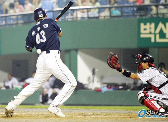 22일 LG 트윈스와 두산 베어스의 잠실경기 두산의 7회초 1사 1,2루서 문희성이 몸 중심으로 날아온 LG 구원 투수 정재복의 투구를 피하지 못하고 허리에 맞아 만루가 되고 있다./잠실=주지영 기자 jj0jj0@osen.co.kr [Copyright ⓒ OSEN(www.osen.co.kr) 무단전재 및 재배포 금지]