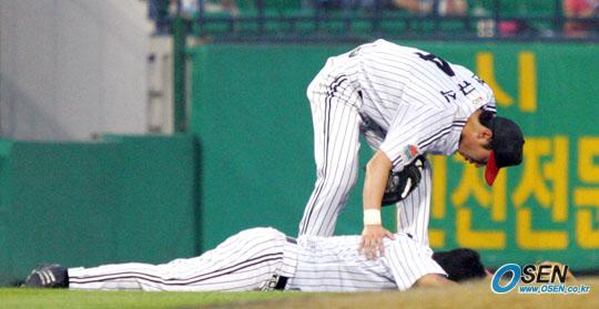 23일 LG 트윈스와 두산 베어스의 잠실경기 두산의 4회초 2사 2루서 손시헌의 좌전 안타 때 다이빙 캐치를 시도한 LG 3루수 박기남이 3루로 뛰던 2루주자 나주환과 부딪쳐 그라운드에 쓰러져 있다. 박기남은 일어서는 순간 자신을 뛰어 넘으려던 나주환과 충돌해 다시 넘어졌고 심판이 주루 방해로 판정, 나주환은 홈을 밟았다./잠실=주지영 기자 jj0jj0@osen.co.kr [Copyright ⓒ OSEN(www.osen.co.kr) 무단전재 및 재배포 금지]
