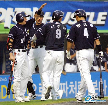 23일 LG 트윈스와 두산 베어스의 잠실경기 두산의 4회초 2사 2루서 손시헌의 좌전 안타 때 2루 주자 나주환(오른쪽에서 두 번째)이 3루로 뛰는 도중 LG 3루수 박기남과 부딪친 뒤 심판의 주루 방해 판정으로 홈을 밟고 있다. 다이빙 캐치를 시도했던 박기남은 일어서는 순간 자신을 뛰어 넘으려던 나주환과 충돌해 다시 넘어졌고 심판은 주루 방해로 판정을 내렸다./잠실=주지영 기자 jj0jj0@osen.co.kr [Copyright ⓒ OSEN(www.osen.co.kr) 무단전재 및 재배포 금지]