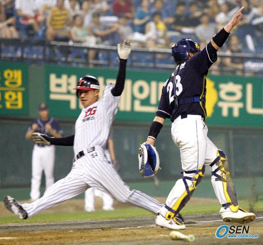 23일 LG 트윈스와 두산 베어스의 잠실경기 LG의 5회말 1사 1,3루서 이병규의 중견수 희생플라이 때 태그업한 3루 주자 이대형이 슬라이딩으로 홈인하고 있다. 볼은 1루 주자의 진루를 방지하기 위해 홈으로 송구되지 않았다./잠실=주지영 기자 jj0jj0@osen.co.kr [Copyright ⓒ OSEN(www.osen.co.kr) 무단전재 및 재배포 금지]