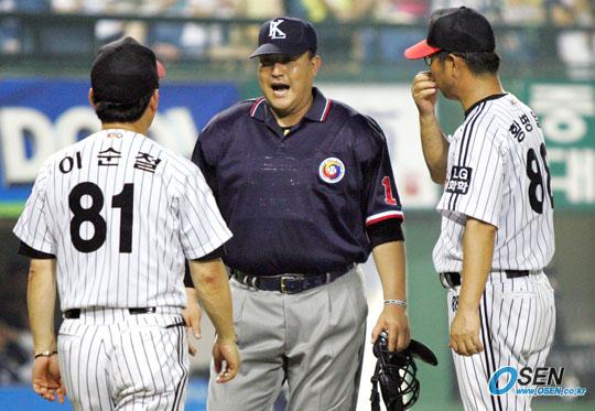 23일 LG 트윈스와 두산 베어스의 잠실경기 LG의 5회말 선두 타자 박기남이 투구에 발을 맞았다는 사인을 덕아웃으로 보내자 이순철 감독(왼쪽)이 어필하러 나왔으나 최수원 구심은 받아 들이지 않았다. 박기남은 결국 볼넷을 얻어 진루에는 성공했다./잠실=주지영 기자 jj0jj0@osen.co.kr [Copyright ⓒ OSEN(www.osen.co.kr) 무단전재 및 재배포 금지]