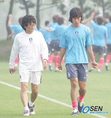 24일 동아시아선수권대회를 대비해 소집된 국가대표 선수들이 파주 NFC에서 더운 날씨에도 불구하고 훈련에 돌입했다. 아인트호벤과의 친선 경기서 발목에 타박상을 입은 박주영은 최주영 팀 닥터와 함께 별도로 간단한 훈련만 소화했다./파주=손용호 기자 spjj@osen.co.kr [Copyright ⓒ OSEN(www.osen.co.kr) 무단전재 및 재배포 금지]