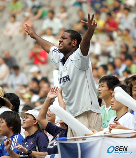24일 올림피크 리옹과 토튼햄 핫스퍼의 피스컵 2005 코리아 대회 결승전이 벌어진 서울 상암 월드컵경기장관중석에서 한 외국인이 자리에서 일어나 토튼햄을 열렬히 응원하고 았다./상암=주지영 기자 jj0jj0@osen.co.kr [Copyright ⓒ OSEN(www.osen.co.kr) 무단전재 및 재배포 금지]
