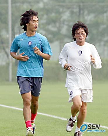 24일 동아시아선수권대회를 대비해 소집된 국가대표 선수들이 파주 NFC에서 더운 날씨에도 불구하고 훈련에 돌입했다. 지난 13일 아인트호벤과의 친선 경기서 발목에 타박상을 입은 박주영은 최주영 팀 닥터와 가벼운 러닝과 스트레칭으로 몸을 풀었다./파주=손용호 기자 spjj@osen.co.kr [Copyright ⓒ OSEN(www.osen.co.kr) 무단전재 및 재배포 금지]