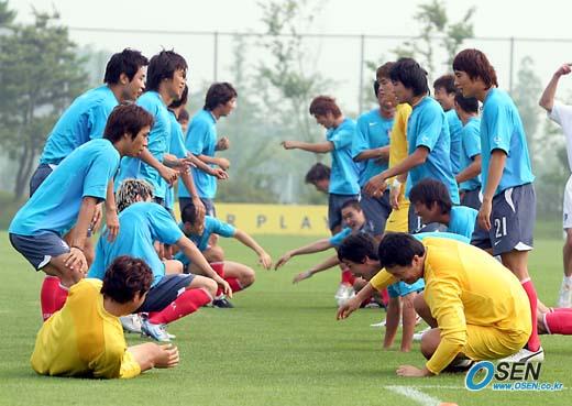 24일 동아시아선수권대회를 대비해 소집된 국가대표 선수들이 파주 NFC에서 더운 날씨에도 불구하고 훈련에 돌입했다. 본격적인 훈련에 앞서 마주 보고 있는 선수의 동작을 따라 하는 훈련에서 이운재(오른쪽)가 김용대(왼쪽)를 흉내내고 있다./파주=손용호 기자 spjj@osen.co.kr [Copyright ⓒ OSEN(www.osen.co.kr) 무단전재 및 재배포 금지]