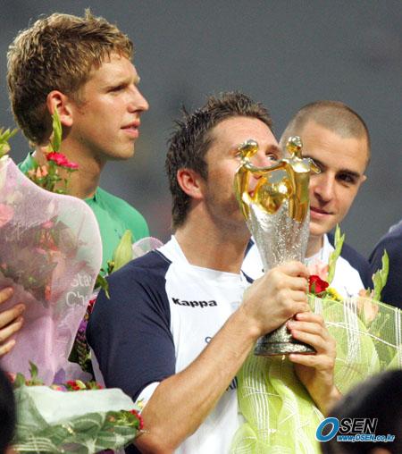 24일 서울 상암 월드컵경기장서 벌어진 올림피크 리옹과 토튼햄 핫스퍼의 피스컵 2005 코리아 대회 결승전 서 3-1로 승리한 토튼햄의 우승 주역 로비 킨이 트로피에 입을 맞추고 있다./상암=주지영 기자 jj0jj0@osen.co.kr [Copyright ⓒ OSEN(www.osen.co.kr) 무단전재 및 재배포 금지]