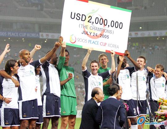 24일 서울 상암 월드컵경기장서 벌어진 올림피크 리옹과 토튼햄 핫스퍼의 피스컵 2005 코리아 대회 결승전서 3-1로 이긴 토튼햄 선수들이 시상대에서 200만달러의 상금판을 높이 들며 우승을 자축하고 있다./상암=주지영 기자 jj0jj0@osen.co.kr [Copyright ⓒ OSEN(www.osen.co.kr) 무단전재 및 재배포 금지]