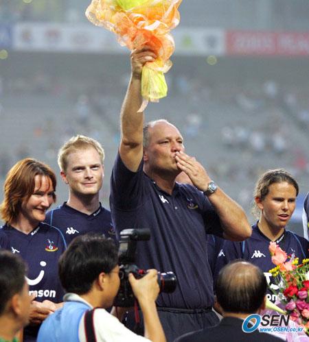 24일 서울 상암 월드컵경기장서 벌어진 올림피크 리옹과 토튼햄 핫스퍼의 피스컵 2005 코리아 대회 결승전서 3-1로 이긴 토튼햄의 마틴 욜 감독(가운데)가 한 손으로 꽃다발을 높이 들고 한 손으로는 입맞춤으로 관중들의 환호에 답하고 있다./상암=주지영 기자 jj0jj0@osen.co.kr [Copyright ⓒ OSEN(www.osen.co.kr) 무단전재 및 재배포 금지]