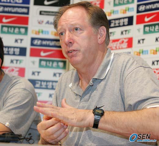 25일 파주 NFC에서 본프레레 감독과 안동고 동기동창인 백지훈 김진규의 기자회견이 있었다. 본프레레 감독이 박주영의 상태를 묻는 질문에 손으로 발바닥 모양을 만들어 발가락과 발바닥의 염증으로 슈팅할 때 통증을 느낀다며 재활하며 더 쉬어야 한다고 말하고 있다./파주=손용호 기자 spjj@osen.co.kr [Copyright ⓒ OSEN(www.osen.co.kr) 무단전재 및 재배포 금지]
