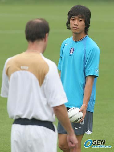 동아시아선수권대회에 나설 국가대표 선수들이 25일 오후 파주 NFC에서 더운 날씨에도 불구하고 훈련을 실시했다. 발바닥 부상으로 정규 훈련에서 제외된 박주영(오른쪽)이 미니 볼을 든 채 야스퍼트 피지컬 트레이너와 얘기를 나누고 있다./파주=손용호 기자 spjj@osen.co.kr [Copyright ⓒ OSEN(www.osen.co.kr) 무단전재 및 재배포 금지]