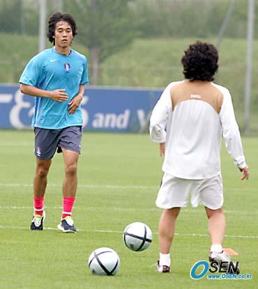 동아시아선수권대회에 나설 국가대표 선수들이 25일 오후 파주 NFC에서 더운 날씨에도 불구하고 훈련을 실시했다. 발바닥 부상으로 정규 훈련에서 제외된 박주영이 최주영 팀 닥터와 함께 가볍게 공을 주고 받으며 재활 훈련을 하고 있다./파주=손용호 기자 spjj@osen.co.kr [Copyright ⓒ OSEN(www.osen.co.kr) 무단전재 및 재배포 금지]