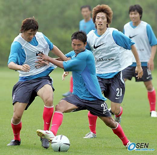 동아시아선수권대회에 나설 국가대표 선수들이 25일 오후 파주 NFC에서 더운 날씨에도 불구하고 훈련을 실시했다. 3개조로 나누어 가진 미니게임에서 이천수(가운데)가 두 손을 써가며 곽희주(왼쪽)와 몸싸움을 벌이고 있다./파주=손용호 기자 spjj@ose.co.kr [Copyright ⓒ OSEN(www.osen.co.kr) 무단전재 및 재배포 금지]